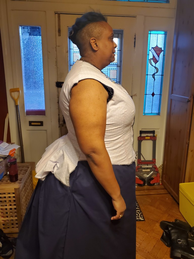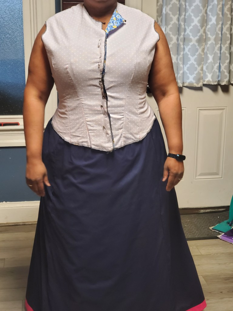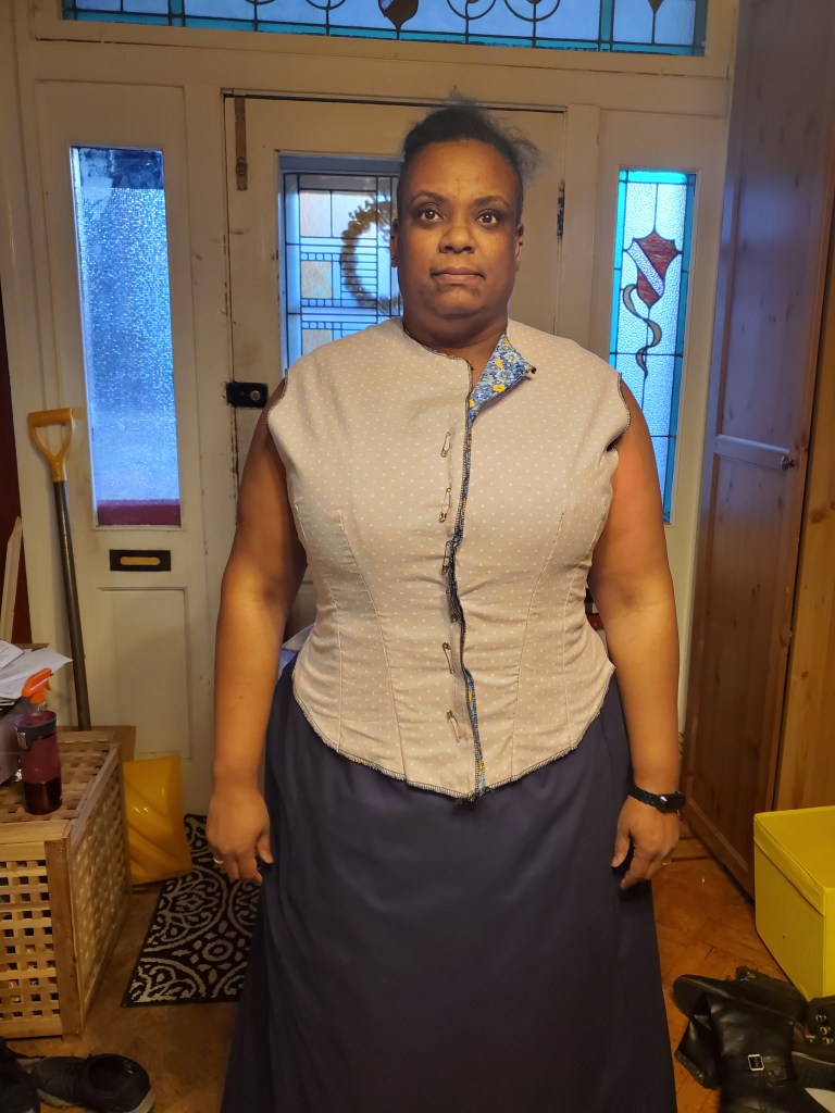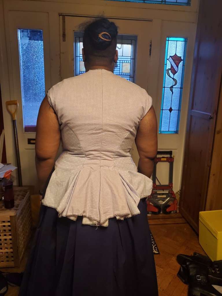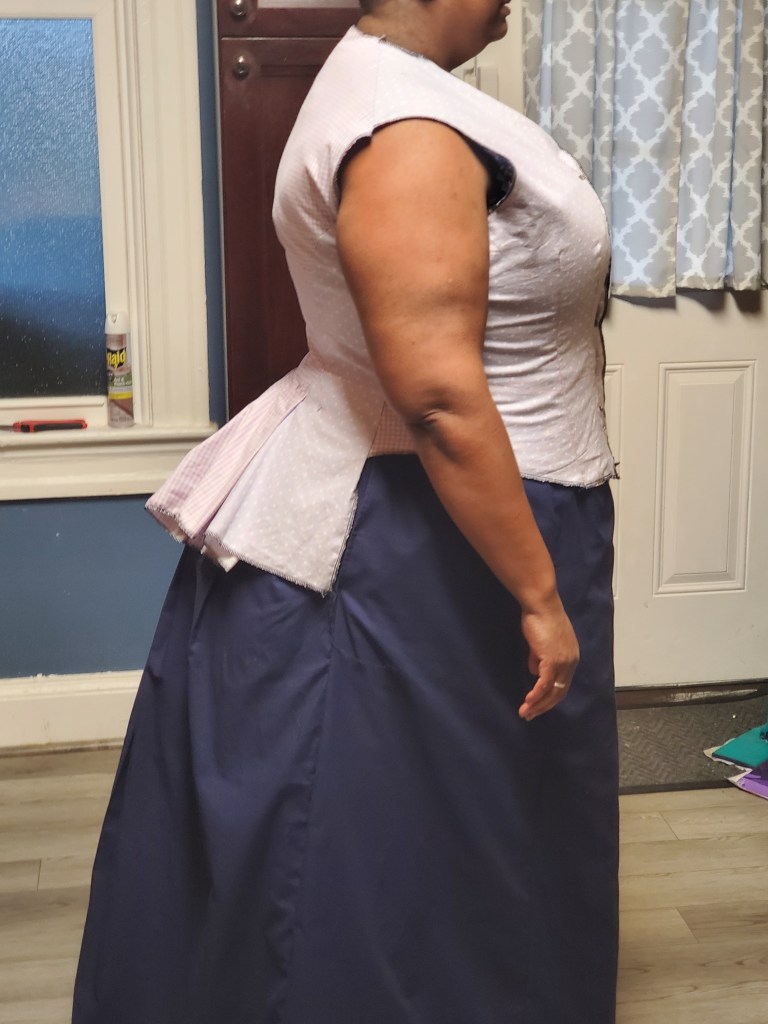 The perfect is the enemy of done. There are so many tiny screwups that no one but me will ever see. I was aiming for “historically adequate” as opposed to accurate so I used a machine to do the sewing, plastic boning, rotary cutters, and all sorts of modern conveniences.